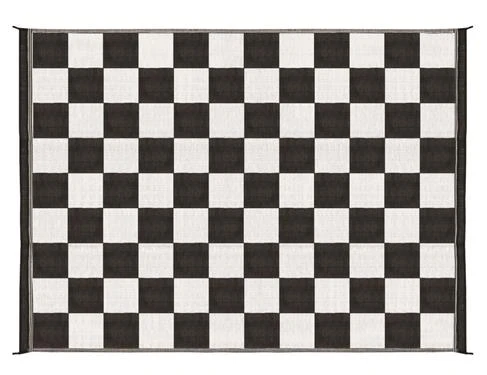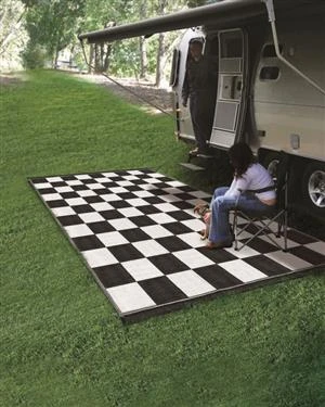 Cleans easily with soap and water. Made of durable, mildew resistant materials, with rust resistant grommets and ground stakes included. Woven design allows snow and rain to drain through mat. Helps keep dirt from being tracked into your RV. Also useful for picnics and beach outings.