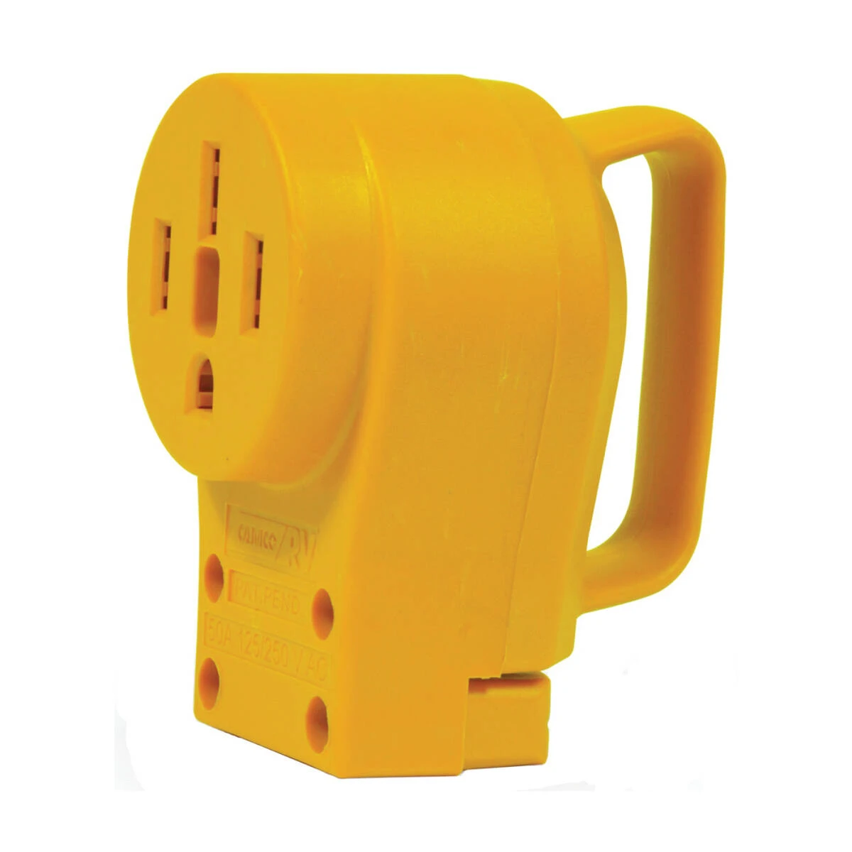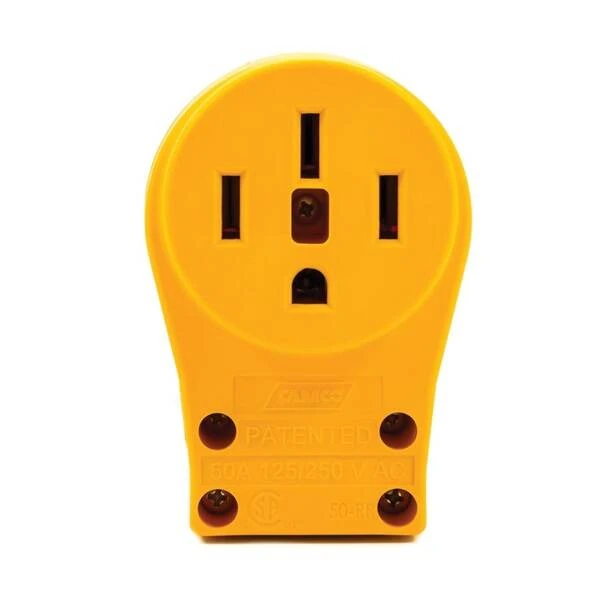 CAMCO RV 50 A female replacement receptacle replaces the existing power cord receptacle utilizing patented PowerGrip handles for ease of use.