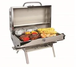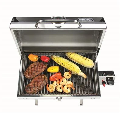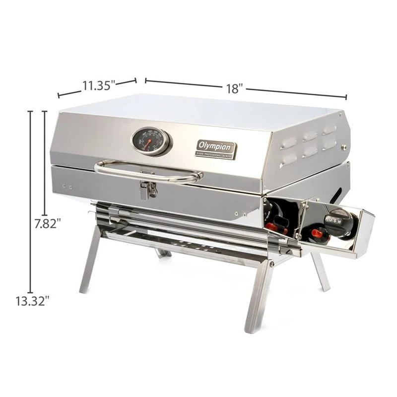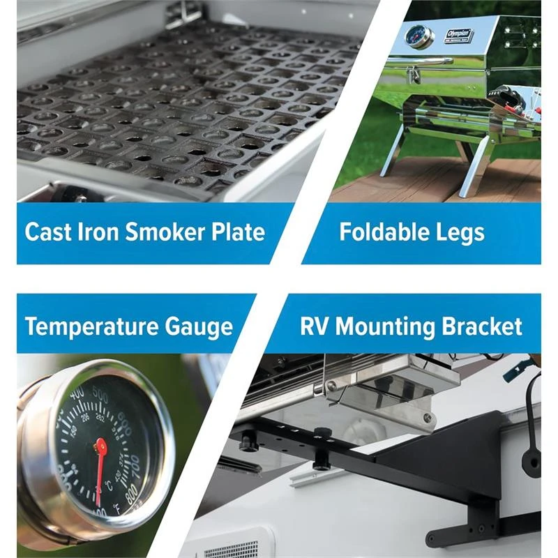 The Camco Olympian 5500 Premium Stainless-Steel Portable RV Gas Grill is designed for RV and outdoor use and is easy to transport. This high quality lightweight 304 stainless-steel barbecue has a large cooking area of 180 square inches. Its cast iron smoker plate is designed to offer the fullest flavor while minimizing grease fires. The stainless-steel burner heats up faster, is easier to clean, and resists rust. The grill is ready to use straight from the box, only assembly required is the mount to hang the grill on the RV mounting rail. It includes a quick-connect hose and valve to use the low-pressure propane supply on an RV or trailer that has a built-in low pressure quick-connect propane connection. The Camco Quick-Connect x ACME Propane Hose (57629) or Quick-Connect x Throwaway Propane Hose (57628) must be purchased separately to use the grill with a 20 lb. propane cylinder or 1 lb. throwaway propane cylinder. Weighs approximately 26 lb.