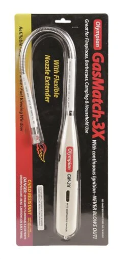 The GM3 GasMatch sets the standard for top-of-the line features. The continuous ignition system means that the flame will never blow out. Long slender design lets you get at hard-to-reach places with total safety. Features safety lock, fully adjustable flame and fuel viewing window. 10,000 starts. Refillable with butane lighter fluid. Uses one AA battery, included. CPSC certified.