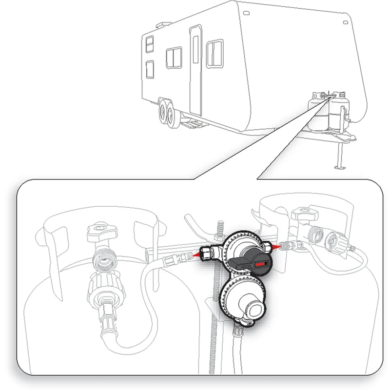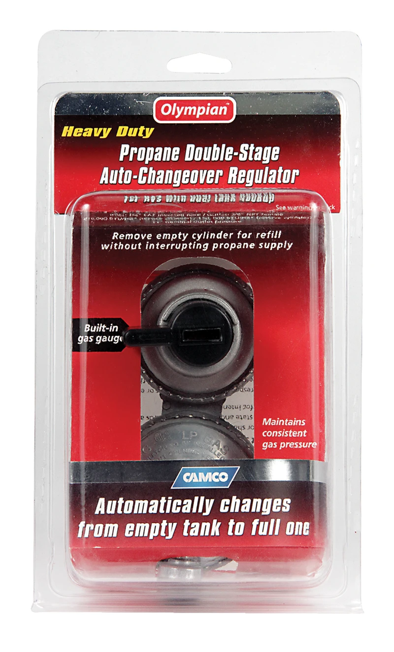 Regulator maintains constant gas pressure and automatically changes from empty tank to full one. Allows removal of empty cylinder for refill without interrupting propane supply. For RVs with dual propane tank hookup. Inlet: 1/4″ Inv. Flare Outlet x 3/8″ NPT female. 11 w.c. / 160,000 BTU. One year warranty. 1/pack.