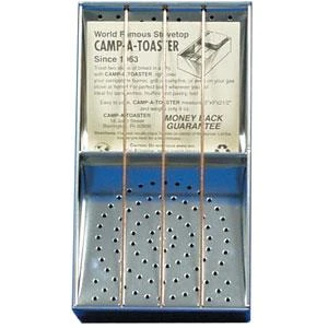 Toast two slices of bread in a jiffy with Camp-A-Toaster, right over your camp-stove burner, grill or campfire, or even on your gas stove at home! Easy to pack, Camp-A-Toaster measures 5 inches x 9 inches x 2.50 inches.