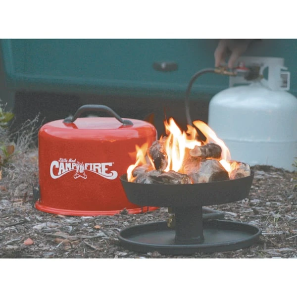 Our Little Red Portable Campfire is great for campsites with restrictions against in-ground fires. Take it tailgating, or put it on the patio…its size is convenient for wherever you need a fire. Realistic log piece and full 9.5″ diameter ring burner help create the natural look and ambiance of from-scratch campfires. Sturdy lid and security latches make it safe and easy to transport. Includes 8′ propane hose for use with standard LP gas cylinders. RV campground approved. 13.25″ fire tray diameter.