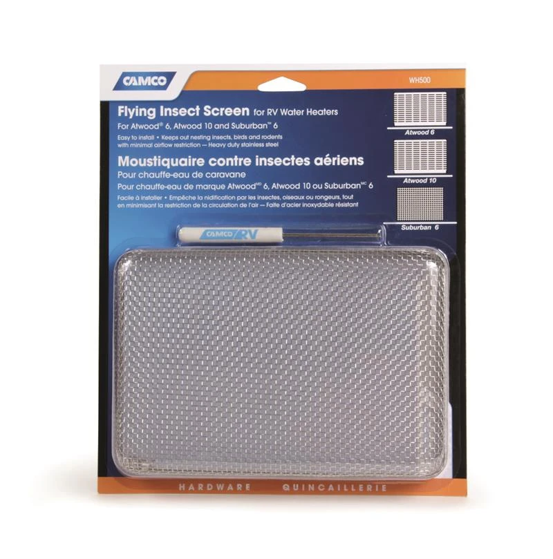 Bug Screen – RV Appliance; Water Heater Vent; For Use With Atwood 6/ 10 Gallon And Suburban 6 Gallon; 6 Inch Length x 8-1/2 Inch Width x 1-1/4 Inch Depth; Stainless Steel; Single; With 2 Spring Fasteners And Installation Tool; With English/ French Language Package; Model WH500