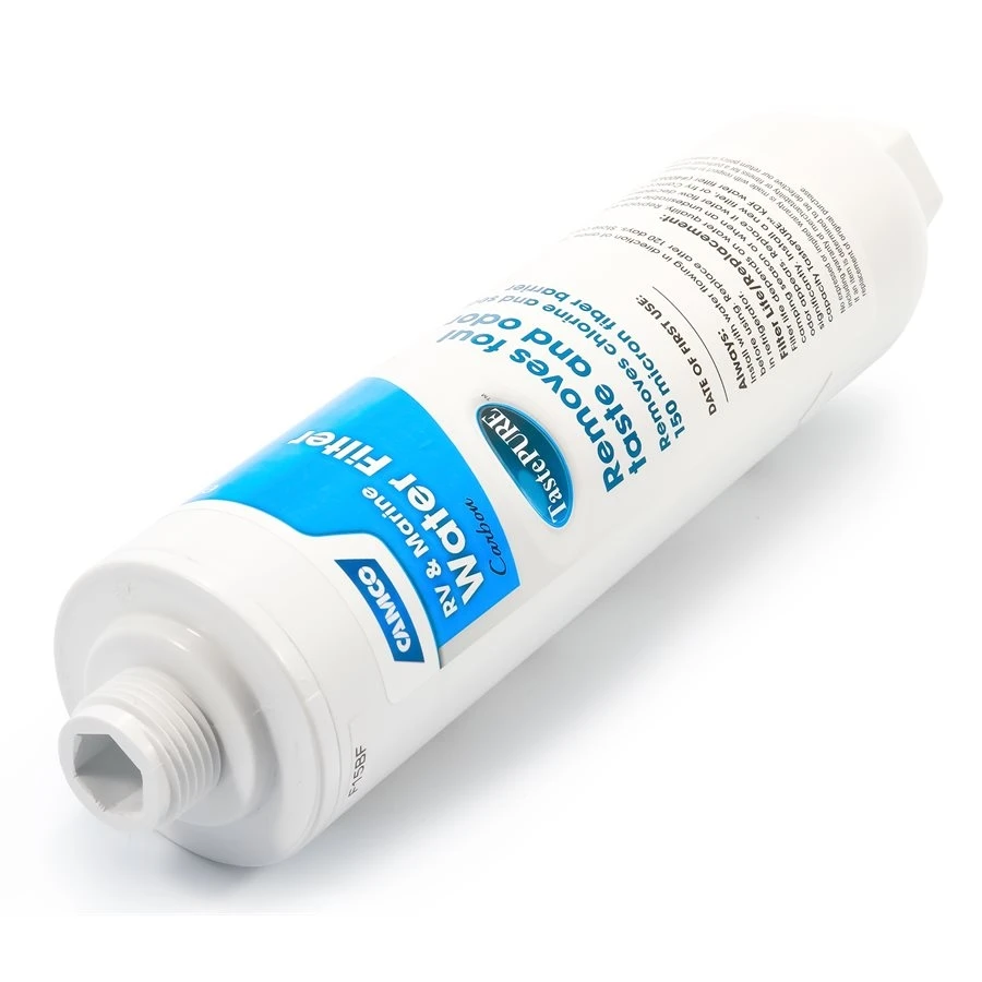 Camco TastePURE RV & Marine Water Filter works to improve the taste and smell of your drinking water for up to 120 days. It filters down to 150 microns. The filter connects to any exterior water connection.